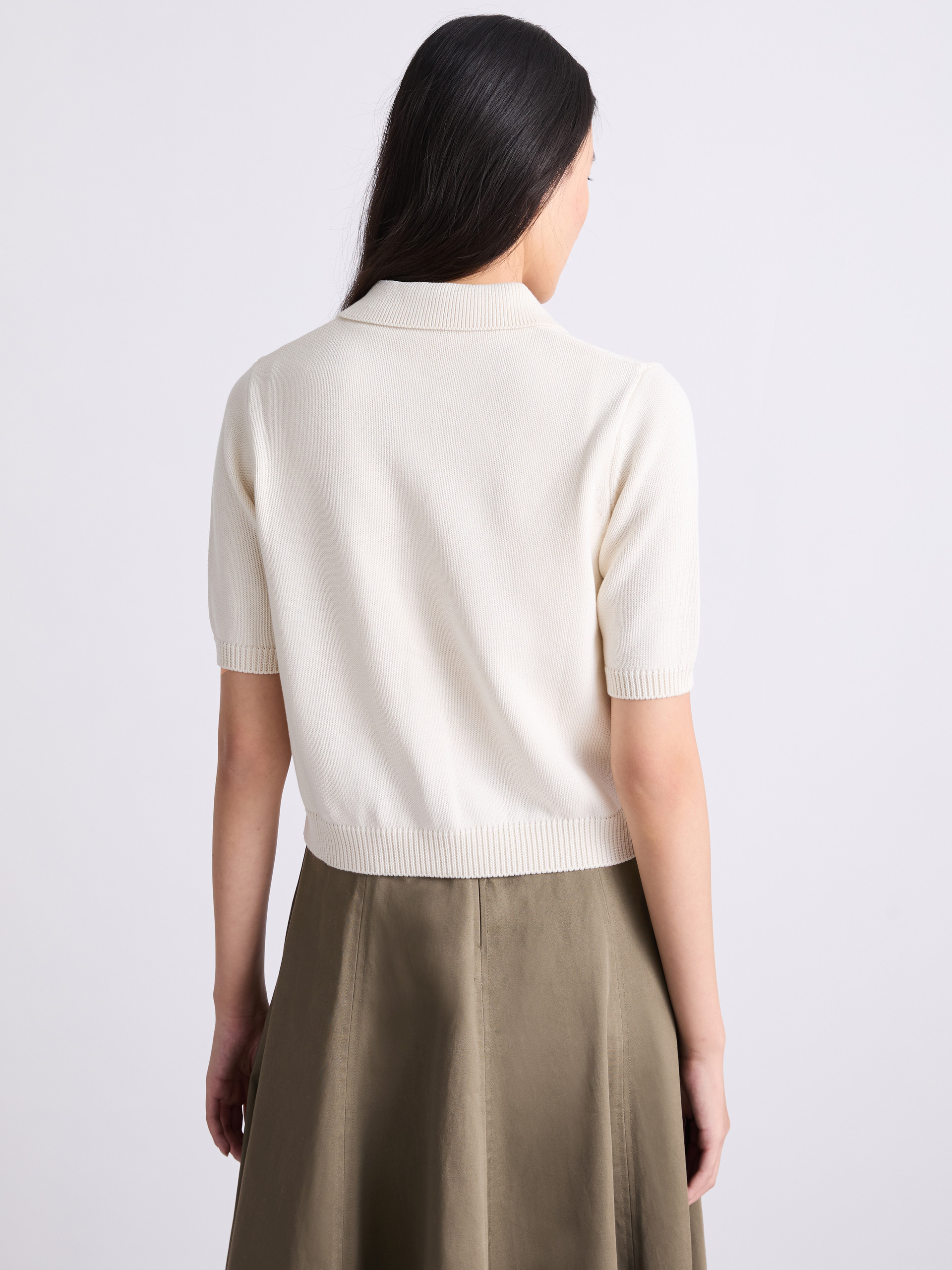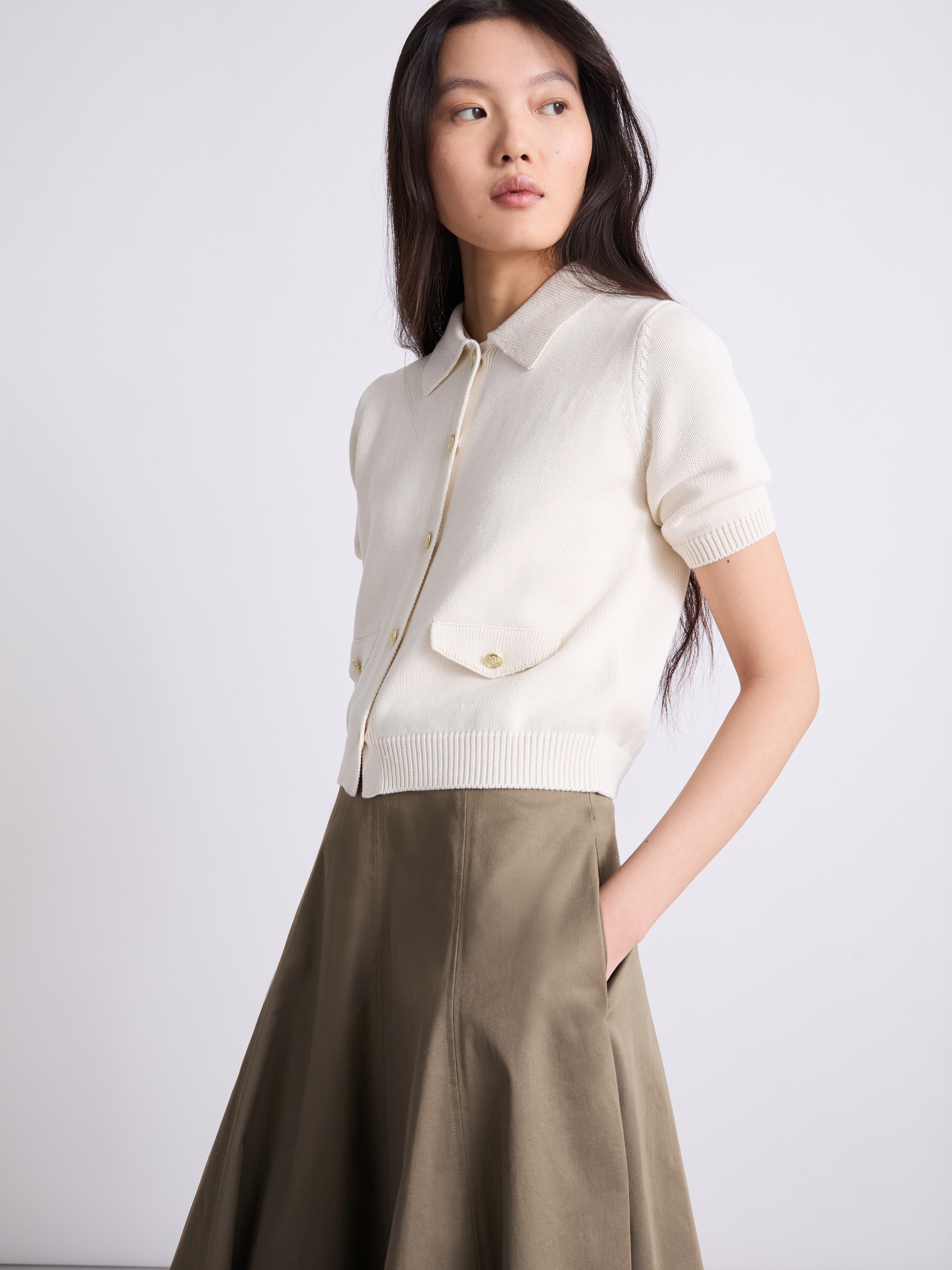 A contemporary take on the bon-ton cardigan, complete with bejewelled branded buttons and 3/4 sleeves. Try wearing this spring-perfect model with loose-fit trousers.